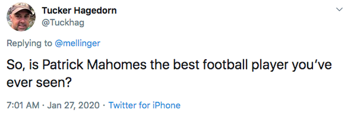 I assume Tucker is referencing Veach’s line in a news conference before Mahomes’ first season as a starter, when he called the quarterback the best player he’d ever seen.