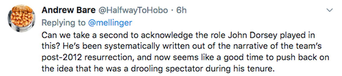 First, you’re right, absolutely, Dorsey is part of this. He took over a mess and he made it better. He inherited a roster headlined by a few stars — six Pro Bowlers on a 2-14 team is a feat that may never again be matched — but dragged down by too many holes. Dorsey was an important part of the solution, improving team speed, most notably.