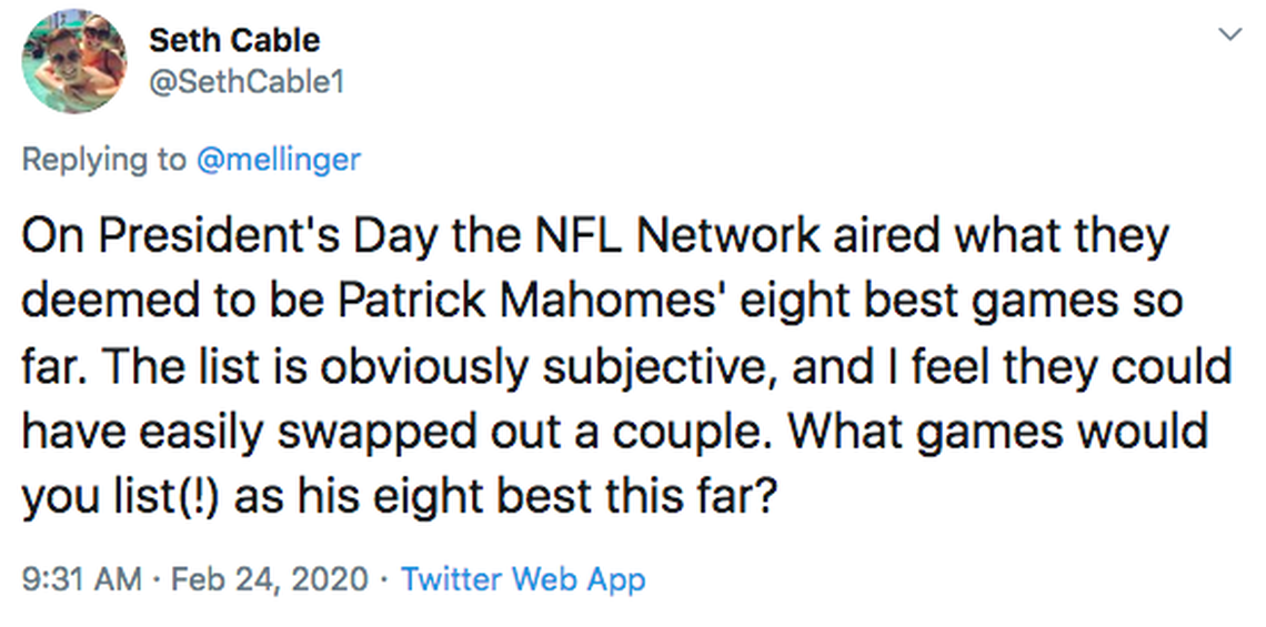 I actually can’t remember if they put tangible rankings on the games but just going by the order of presentation this would be NFL Network’s rankings of Mahomes’ best games: