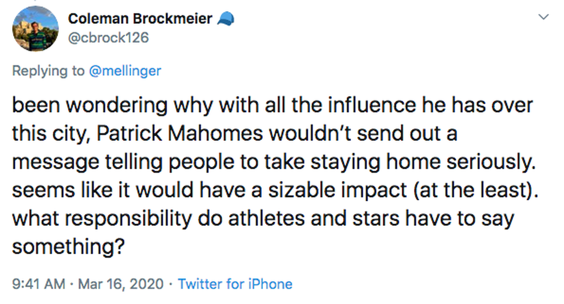 The first is that, yes, Mahomes has a lot of influence and he could use it to help keep people safe. If he chose to post a video or release a statement there is little doubt that it would do at least some good.