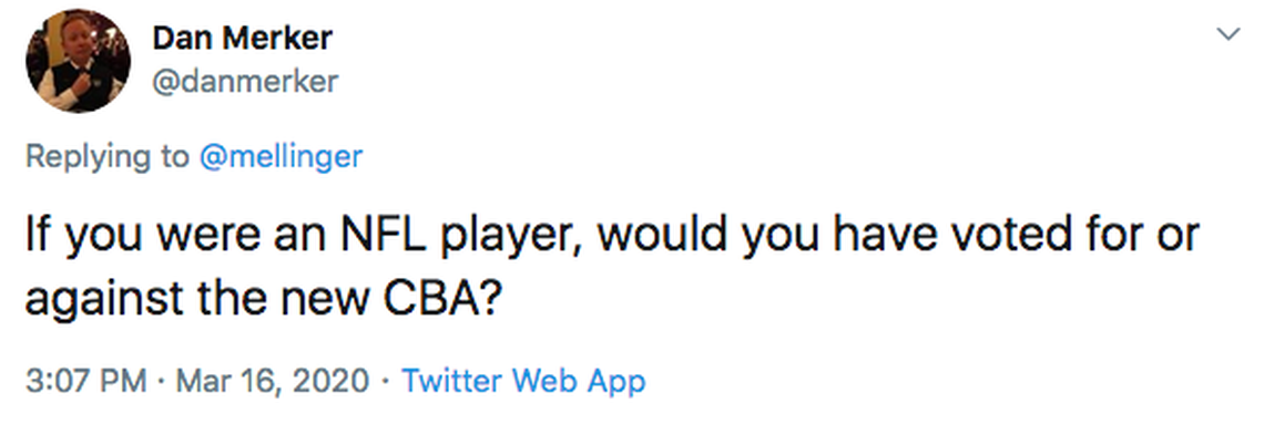 Because you’re asking me how I’d vote, which means I’d have to imagine being an NFL player, and because most of the league makes at or near the minimum I’d have to imagine whether I’d be willing to give up a year of the most money I’d ever made with the understanding that history has shown my stature in life to be replaceable.