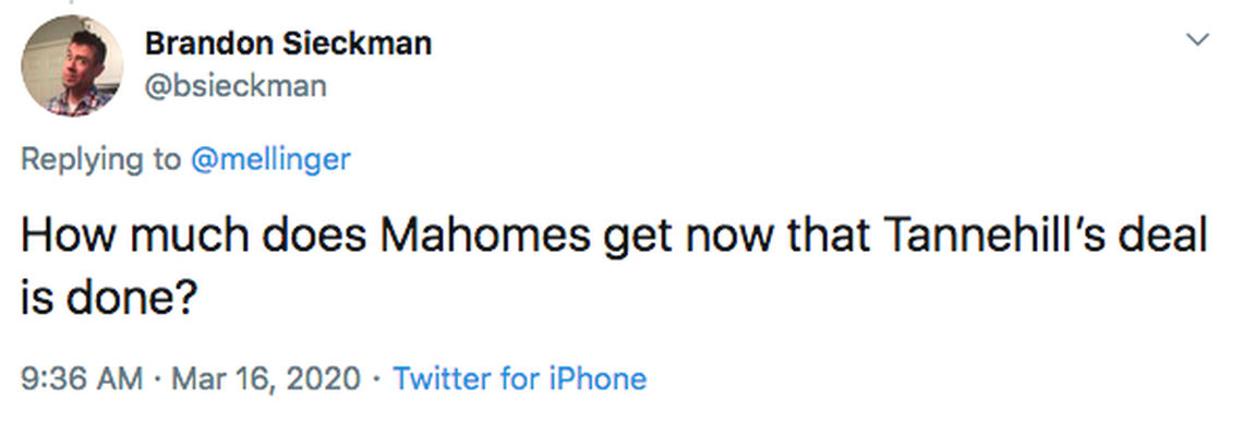 Put another way: Tannehill’s contract is as relevant to Mahomes’ negotiation as the price of a banana is on ribeye.