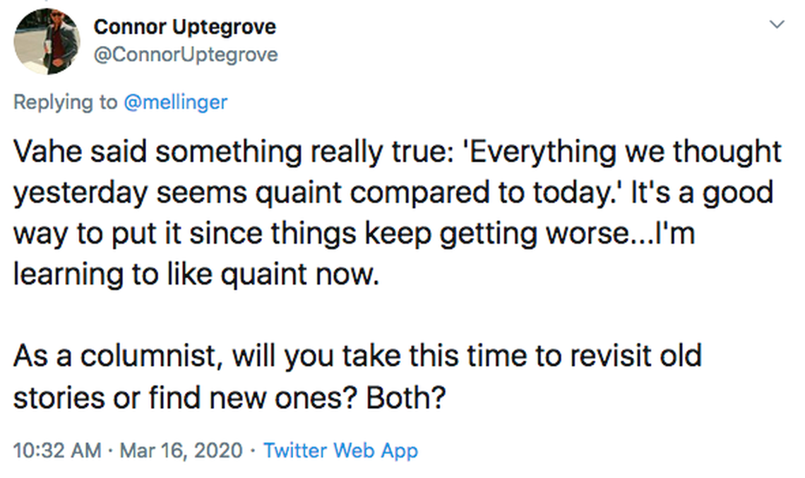 One specific request this week: I want to know how you’re dealing with all of this. I want to know if you work by the hour and are worried about what’s next. I want to know if you have a parent or grandparent you can’t see, or a restaurant you just opened, or a job you needed that just fell through.