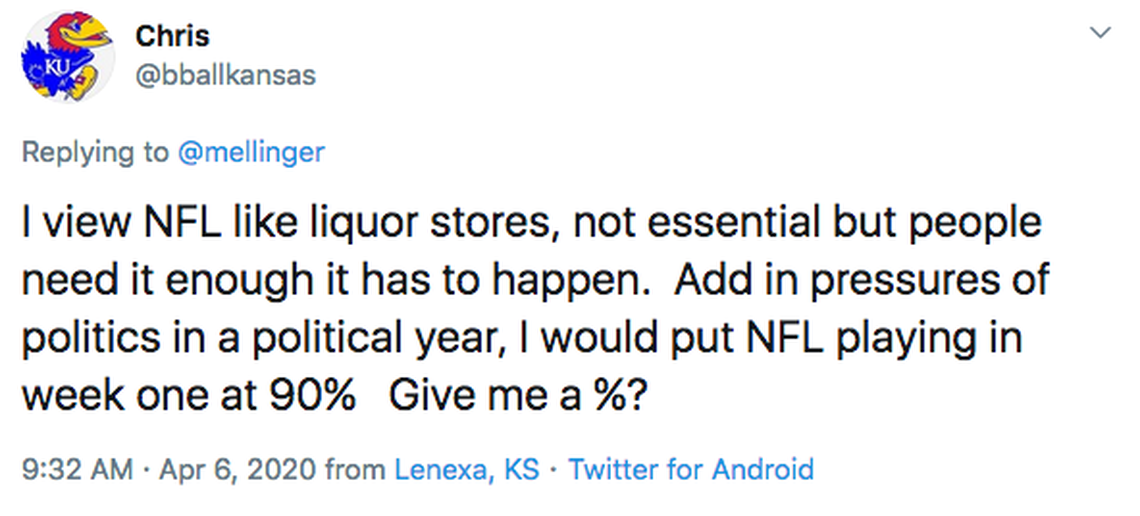 I wrote about some of this in the column the other day, but I’m just not sure how we get where we need to be for games to be played in the time we have before the NFL season would start in 156 days (presumably at Arrowhead Stadium).