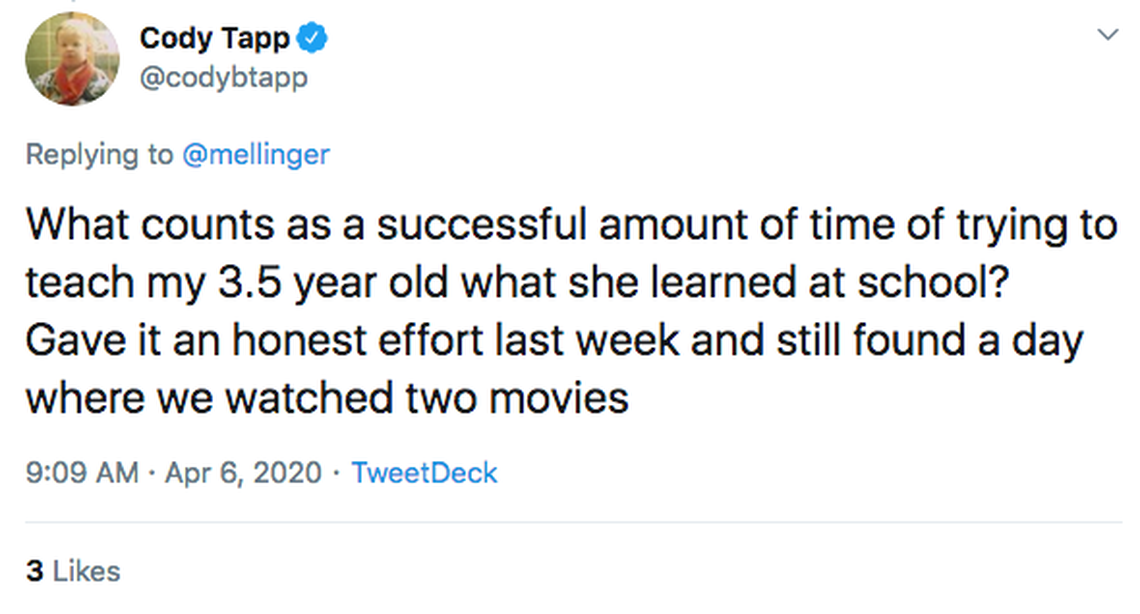 The teachers have been great about sending daily lesson plans and materials. I’m sure there are families getting through 100 percent of it, but that’s not us, and it’s not going to be us.