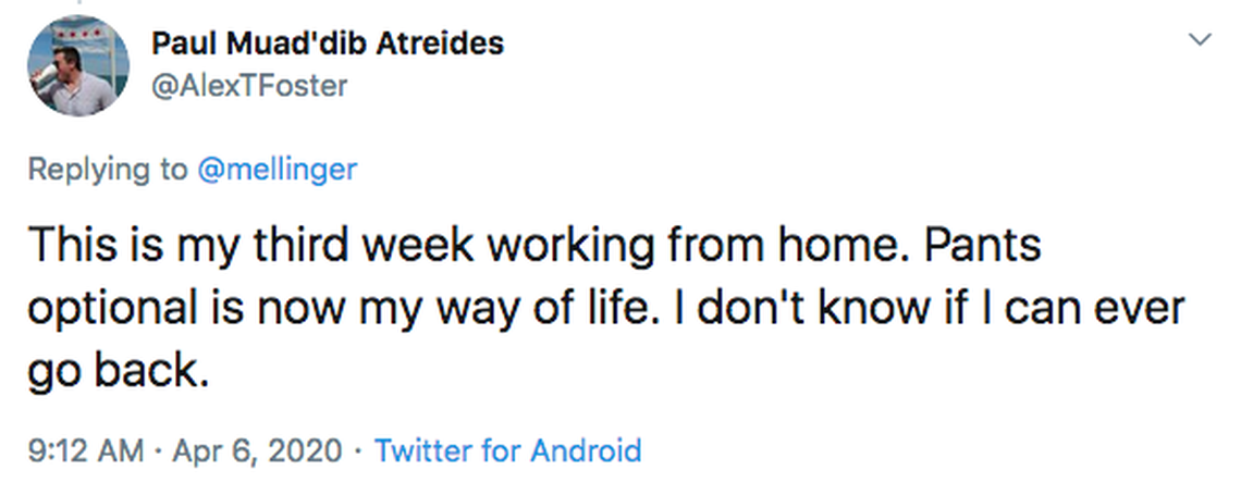 But even with these significant challenges it’s nice to feel some camaraderie with more of you. I simply cannot imagine why any of you are wearing anything that requires a belt. If it’s not made of tri-blend cotton or assembled with an elastic waist, what are you even doing?