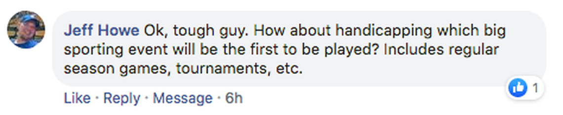 I know we’ve always colored outside the lines a bit and talked about things other than sports but I did wonder if we could survive here. These are early days still, unfortunately, because nobody seems to have a grip on when sports will return (I’ll guess below, though!).