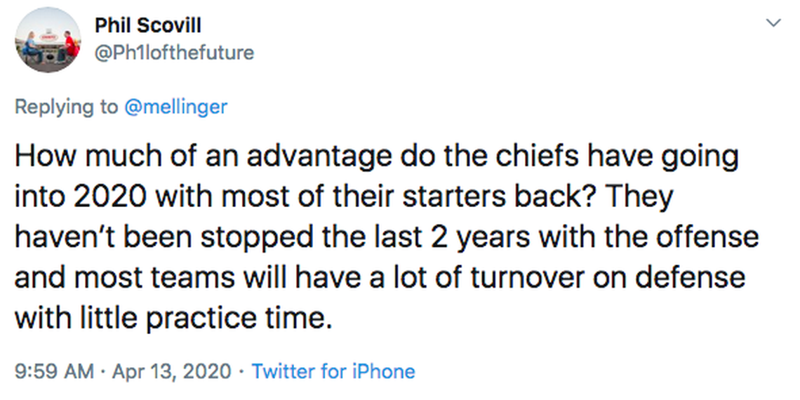 The more you think about it the more the field tilts the Chiefs’ way. Because it’s more than just continuity. The teams that are going to be best prepared on the other side of this are the teams with players genuinely dedicated to the collective purpose, and not a business transaction.