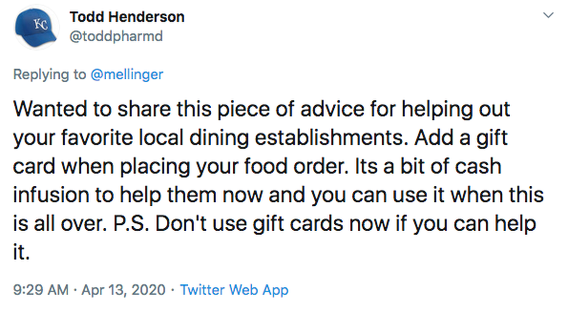 These restaurants need us, and if we want them to be open when things get closer to normal they need our help now.