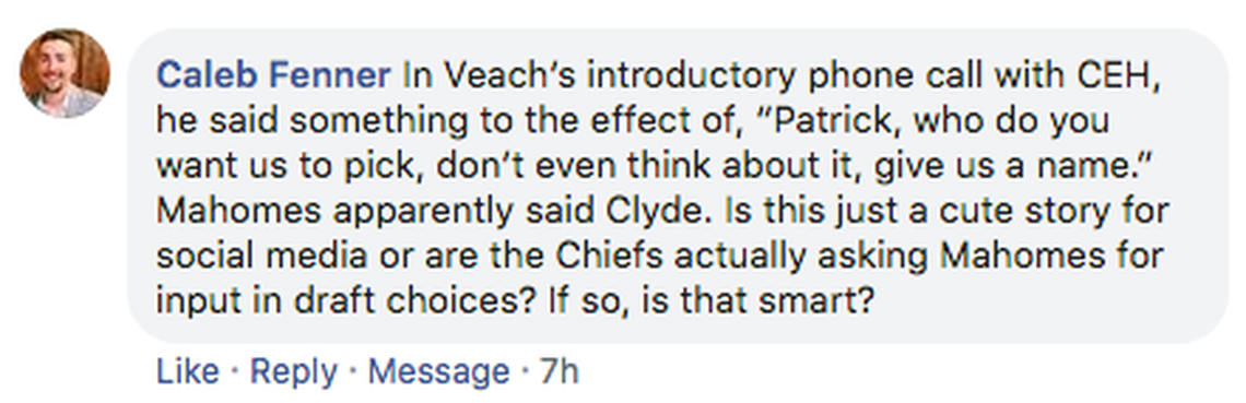 Brett Veach and his scouts are hard-working and conscientious professionals. Patrick Mahomes is a unicorn, but he’s not a scout. That’s not his job. He doesn’t make picks.