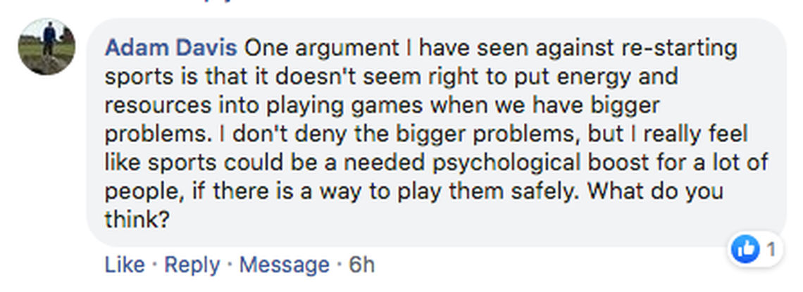 The arguments on both extremes are silly and counterproductive: if you want sports to return, it doesn’t mean you think everyone’s grandmother should die. And if you want to be cautious, it doesn’t mean you want all small businesses to close and more people to lose jobs.