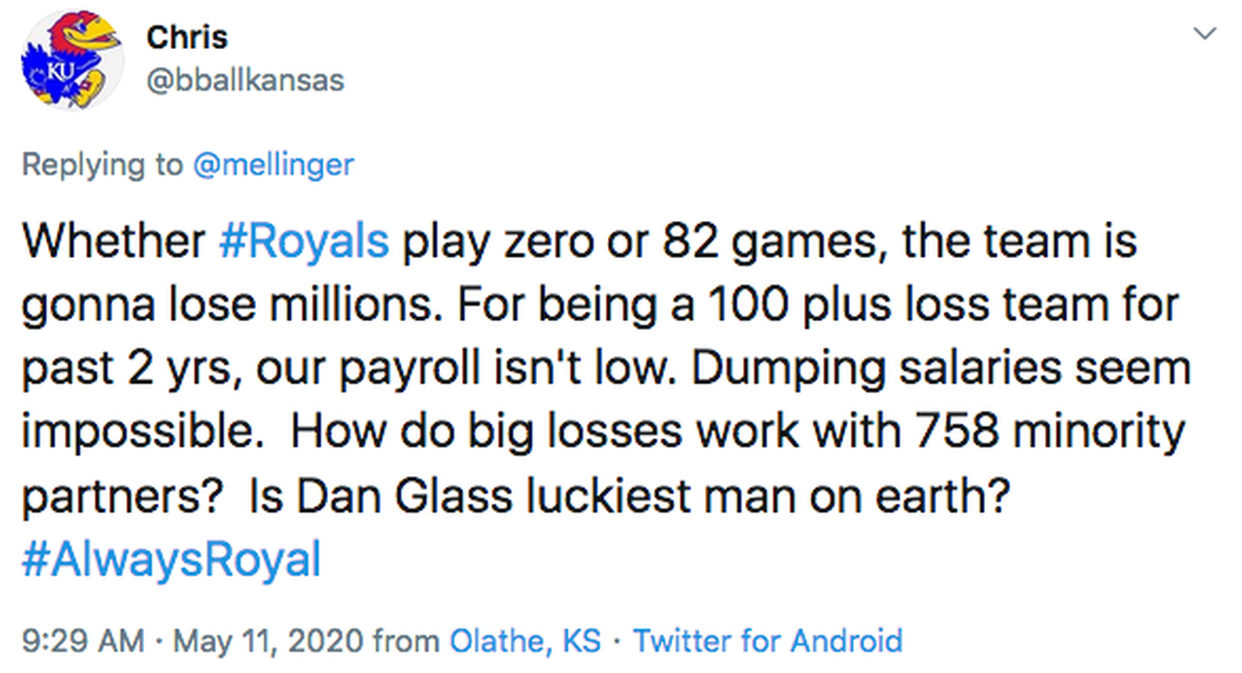 The Royals’ 2020 payroll was scheduled to be around $73 million, which ranked in the bottom five of baseball. They’ll end up paying out significantly less than that with a shortened season, but obviously their revenues will crater.