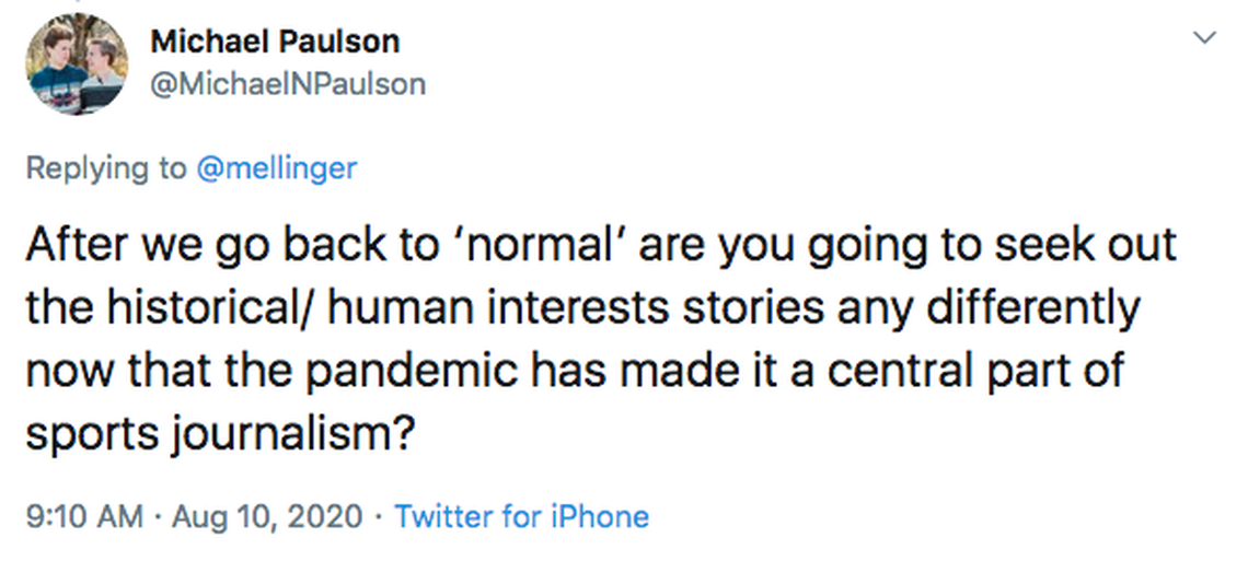 I’ve thought about the general push of your question a lot. About what I’ll do differently now. I do believe the last five months or so have amplified the beauty and occasional importance of sports, and that those are gifts worth cherishing. I also believe that, just functionally here, it’s amplified the need for good relationships to do this job well.