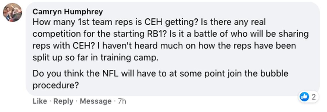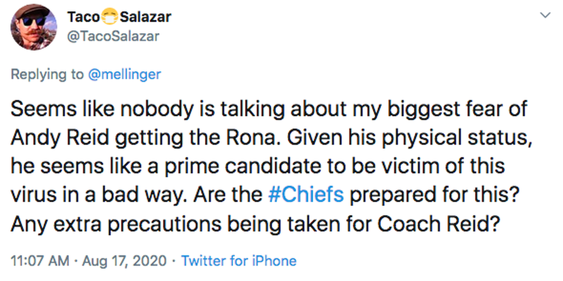 Just to be sure, I want to emphasize that last point with its own paragraph: Reid is vulnerable to COVID-19 and, if he were to test positive, the concerns would be much different and bigger than if, say, Clyde Edwards Helaire caught it*.