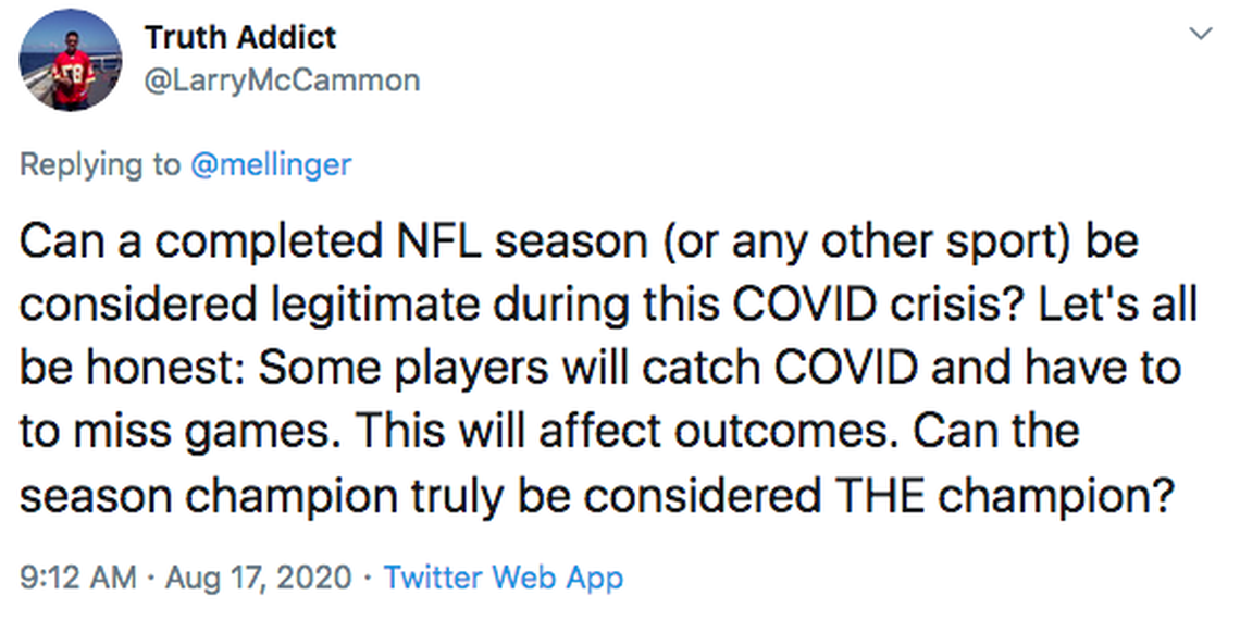 But that’s an option. I’d be surprised if the NFL switched lanes midstream, though, and I’d imagine doing so might be functionally impossible. If we got to the point that this was a real conversation, it’s probably because the virus has spread even more, which means bigger problems in the world and the need to pause for at least a week or two for teams to quarantine and test and make sure they’re safe.