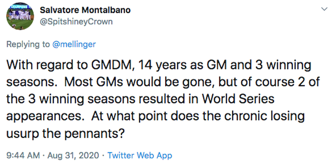 I have no doubt that they respect each other, but I also have no doubt that Sherman sees consecutive 100-loss seasons as unacceptable and that with his time in the game has a name or two of people he’d trust to run a front office.
