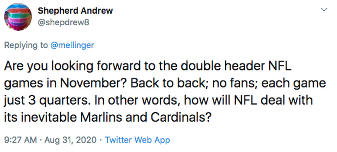 They’re giving it a try, and if the thing sinks, it’s going to sink because fans aren’t following the guidelines. I have many doubts about whether fans will follow those guidelines, and certainly understand why (at last count) 27 of 32 NFL teams are not allowing fans.