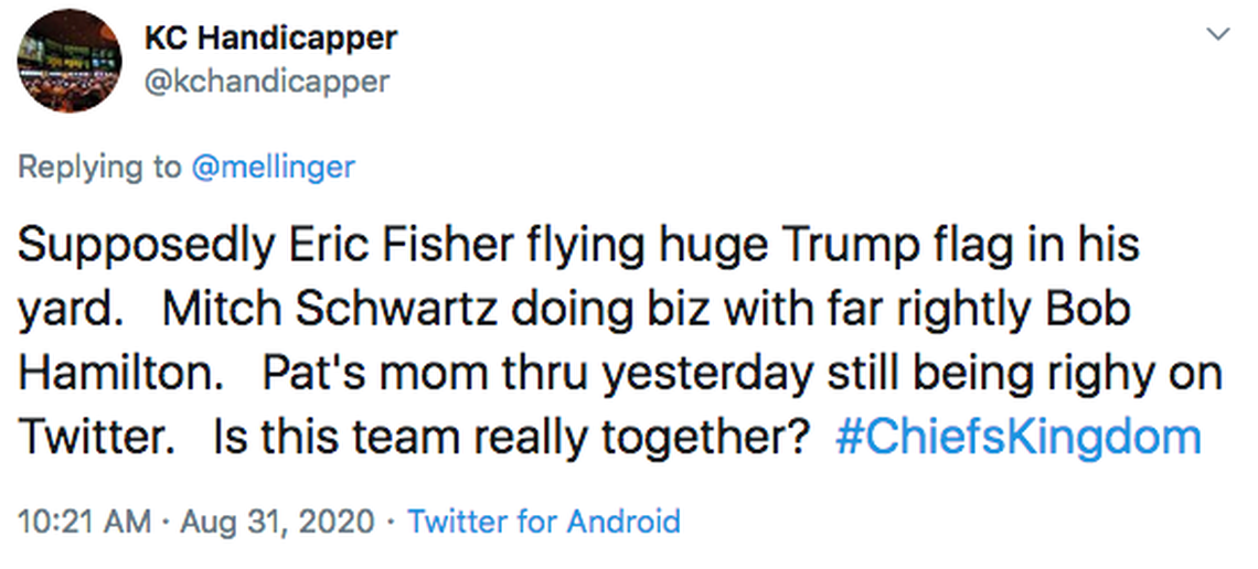 Being together doesn’t mean you have to agree politically, and it sure as heck doesn’t mean you have to agree on a particular candidate or party. No NFL locker room has ever agreed on a presidential election, and it shouldn’t.