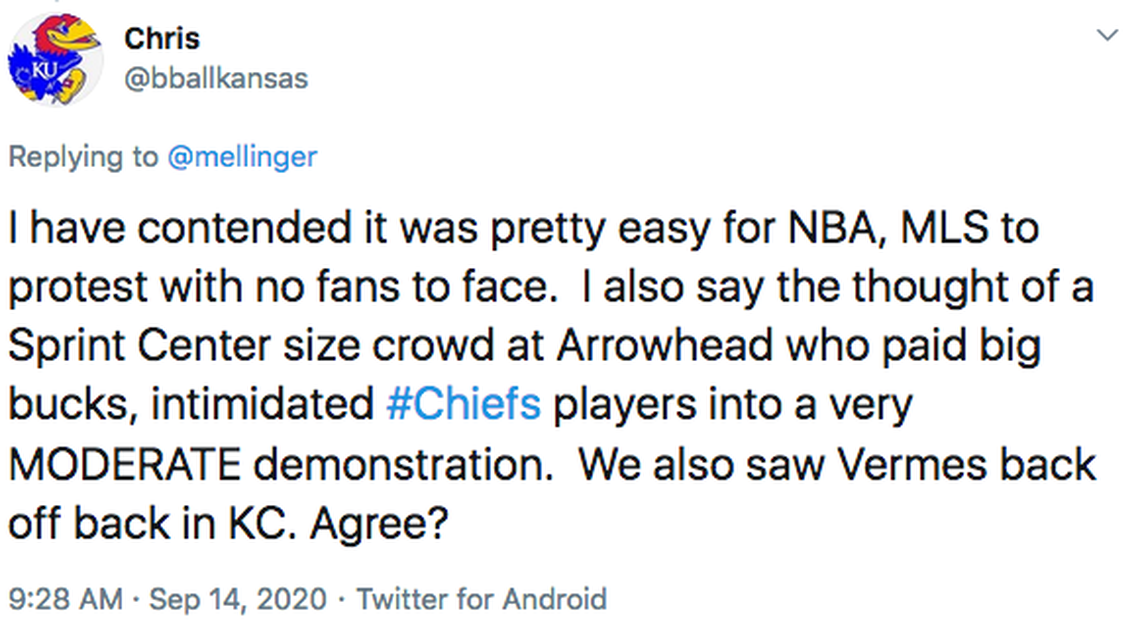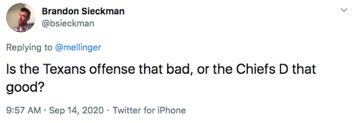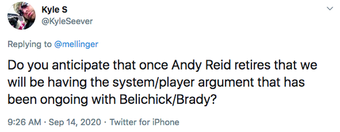 I understand your question refers to the NFL, and I’m not trying to avoid it. But I thought it was clean. Last week, right up until gameday, Andy Reid was among those openly curious about the level of play we’d see with a condensed practice schedule and no preseason games.