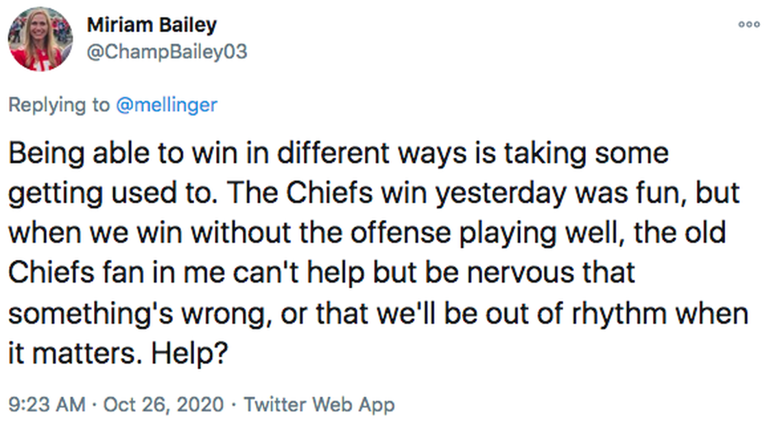 The second thing I keep thinking about is that if your team has Andy Reid, Patrick Mahomes, Eric Bieniemy, Tyreek Hill, Travis Kelce, and Clyde Edwards-Helaire and your biggest worry is the offense ... then you don’t have any big worries.