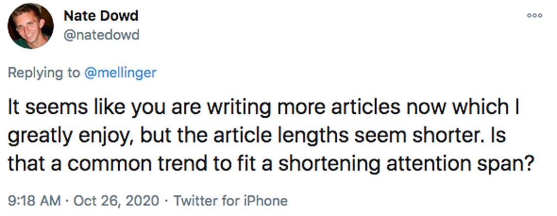 I hope part of you noticing is that hopefully even the longer ones read quicker, but I have been trying to keep columns shorter.